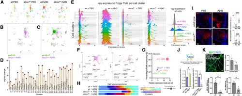 npy expression is reduced with abca7 knockout (A) UMAP clustering for individual experimental groups of wild-type/PBS, wild-type/Aβ42, abca7+/−/PBS, and abca7+/−/Aβ42. (B) Combined UMAP for wild type (green) and abca7 knockout (violet) shows overlapping cell clusters. (C) Combined UMAP for wild-type + Aβ42 (green) and abca7+/− + Aβ42 (violet) identifies a specific neuronal cluster (Cluster 0) that is enriched in Aβ42-treated wild-type animals, but this cluster is significantly diminished in abca7 knockout. (D) Top marker genes for every cell cluster identify neuropeptide Y (npy) as the top marker for cluster 0. Log fold change is a measure of the difference of expression of the top markers in their clusters. (E) Ridge plots for npy expression in wild-type + PBS, wild-type + Aβ42, abca7+/− + PBS, and abca7+/− + Aβ42 groups in all cell clusters. The rightmost plot is combination of all cells. (F) Individual expression plots for npy in wild type (left) and abca7 knockout (right) after Aβ42. Cluster 0, expressing npy, is strongly reduced. (G) A Distribution graph for expression score of npy in neurons. Expression score is a combinatorial measure for the percentage of cells expressing npy (y axis) and the average relative read number per cell (x axis). Amyloid induces the expression score in wild-type animals but not in abca7 knockout. (H) Proportions of all cell clusters in wild-type and abca7+/− animals with and without Aβ42. (I) Immunofluorescence for Npy with DAPI counterstain in wild-type and abca7 knockout animals with or without amyloid toxicity (WC, wild-type + PBS control; WA, wild-type + Aβ42; AC, abca7+/− + PBS control; AA, abca7+/− + Aβ42). Quantification of image fluorescence intensities shown in the graph. One-way ANOVA with Brown-Forsythe and Welch post test with two-stage linear step-up procedure of Benjamini, Krieger, and Yekutieli correction was used for statistical analyses. (J) ELISA assay for Npy. Aβ42 induces Npy protein in wild-type animals but not in abca7 knockout. Parametric t test was used for statistical analyses. (K) MAP2 immunostaining and RT-qPCR for excitatory (SLC17A7) and inhibitory (GAD1) neuron markers. Lower graphs show RT-qPCR results for the expression of ABCA7 and NPY in control and ABCA7 knockout neurons. Data points are technical replicates. ∗p < 0.05, ∗∗∗∗p < 0.0001; not significant (ns), p > 0.05. Scale bars, 50 μm. See also Figures S2–S4 ; Data S1 , S2 , and S3 ; Table S1 . |