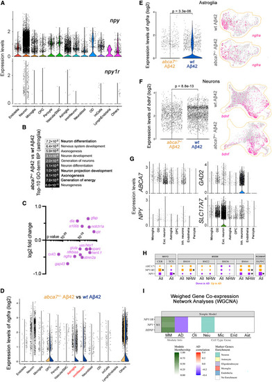 NPY is reduced in Alzheimer’s brains and interacts with BDNF-NGFR signaling (A) Violin plot for npy and npy1r expression in every identified cell type in zebrafish. (B) Top ten enriched GO terms when abca7+/− + Aβ42 and wild-type + Aβ42 were compared indicate altered neurogenesis mechanisms in astroglia. (C) Neurogenic genes are downregulated and quiescence genes are upregulated in astroglia after abca7 knockout. (D) Violin plot for expression of ngfra in astroglia when abca7+/− + Aβ42 is compared to wild-type + Aβ42. (E) Expression of ngfra is strongly reduced in astroglia. (F) Ngfra ligand Bdnf is significantly reduced in neurons. (G) Expression of ABCA7 and NPY in human brains (data reanalyzed from Lau et al. 60 ), showing co-expression in neurons. (H) Expression analyses in various AMP-AD brain transcriptome datasets indicate uniform downregulation of NPY with AD. Asterisks indicate statistical significance (p < 0.05). (I) Weighed gene co-expression network analyses based on Mayo Clinic temporal cortex (TCX) RNA-seq data indicate NPY, NPY1R, and BDNF expressions are negatively correlating with AD and are associated with neurons. See also Figure S4 ; Data S1 , S2 , S3 , S4 , and S5 ; Tables S1–S3 . |