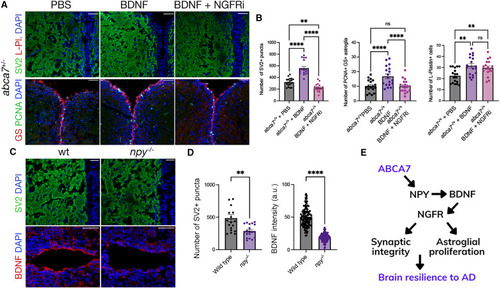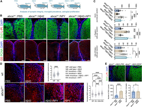 ABCA7 regulates synaptic integrity and astroglial proliferation through BDNF (A) Experimental setup for investigating the biological relevance of NPY to abca7 function and amyloid-induced alterations in synaptic integrity, microglial activity, and astroglial proliferation. (B) Immunofluorescence for SV2 + L-plastin and GS + PCNA with DAPI counterstains in abca7+/− + PBS, abca7+/− + Aβ42, abca7+/− + NPY, and abca7+/− + Aβ42 + NPY brains. (C) Quantification for number of SV2-positive synaptic puncta, L-plastin-positive microglia, and GS/PCNA double-positive proliferating astroglia. n = 4 animals from both sexes and ≥20 brain sections per group. One-way ANOVA with Tukey’s multiple comparison test was used for statistical analyses. No comparison bar indicates no significance. (D) BDNF immunoreactivity in wild-type and abca7 knockout zebrafish with and without Aβ42. Aβ42 induced BDNF (red) in wild-type animals but not in abca7 knockout. Injection of NPY with or without Aβ42 restores the induced BDNF expression levels. Non-parametric Kolmogorov-Smirnov test comparing cumulative distributions and one-way ANOVA with Tukey’s multiple comparison test were used for statistical analyses. (E) Immunofluorescence for SV2 and L-plastin with DAPI counterstain in abca7+/− + Aβ42 + PBS and abca7+/− + Aβ42 + BDNF zebrafish brains. Quantification for the number of SV2-positive synaptic puncta and the number of L-plastin-positive microglia. Non-parametric Kolmogorov-Smirnov test comparing cumulative distributions was used for statistical analyses. BDNF rescues synaptic integrity changes in abca7+/− knockout similar to NPY. n = 4 animals from both sexes, with 18 brain sections per group. ∗p < 0.0332, ∗∗p < 0.0021, ∗∗∗p < 0.0002, ∗∗∗∗p < 0.0001; not significant (ns), p > 0.0332. Scale bars, 50 μm. See also Figures S1 and S4 , Data S1 and S3 , and Table S1 . |