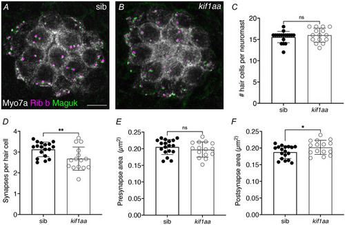 A,B, example immunolabel of neuromasts at 5 dpf in a kif1aa mutant (B) or sibling control (A). Myosin7a (Myo7a) labels hair cells, Ribeye b (Rib b) labels ribbons or presynapses, and MAGUK labels postsynapses. C, the number of hair cells per neuromast is the same in kif1aa mutants compared with sibling controls (control: 15.6 ± 1.3; kif1aa: 16.0 ± 1.7, unpaired t test, P = 0.399). D, Kif1aa mutants have fewer complete synapses per cell (control: 3.13 ± 0.35; kif1aa: 2.68 ± 0.56, unpaired t test, P = 0.00870). E, in kif1aa mutants, the average area of Rib b puncta (presynaptic) was similar to sibling controls (control: 0.21 µm2 ± 0.02; kif1aa: 0.20 µm2 ± 0.02, unpaired t test, P = 0.345). F, in kif1aa mutants, the average area of MAGUK puncta (postsynaptic) was slightly larger compared with sibling controls (control: 0.19 µm2 ± 0.02; kif1aa: 0.20 µm2 ± 0.02, unpaired t test, P = 0.0498). n = 18 control and 15 kif1aa neuromasts in C–F. Scale bar in A = 5 µm.