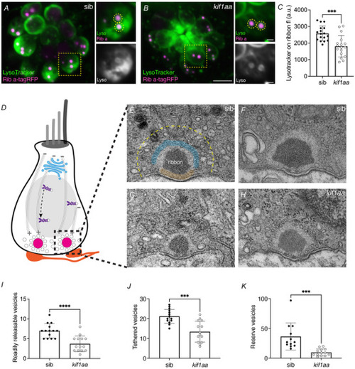 A,B, example live images of neuromasts at 5 dpf in a kif1aa mutant (B) or sibling control (A) at 5 dpf. Synaptic vesicles are labelled with LysoTracker Green (green), and ribbons are labelled with Rib a‐TagRFP (magenta). The yellow dashed lines in A and B were used to create the insets shown to the side. The top inset image shows the base of this single hair cell labelled with Lysotracker (green) and Rib a‐TagRFP (magenta), while the bottom inset shows just LysoTracker (grey). Insets are only a partial projection (single cell) of the larger image. The yellow dashed circles indicated ROIs used to quantify LysoTracker intensity at ribbons. C, the average LysoTracker intensity at ribbons is significantly lower in kif1aa mutants compared with sibling controls (control: 2580 ± 450; kif1aa: 1810 ± 650, n = 10 control and kif1aa neuromasts, unpaired t test, P = 0.0003). D, schematic of an individual hair cell with a ribbon (black dashed box) like ones examined for TEM. E–H, representative TEM images of ribbon synapses from kif1aa mutants (G,H) or wild‐type sibling controls (E,F) at 5 dpf. In E ‘tethered vesicles’ are in blue, ‘readily releasable vesicles’ in orange, while ‘the reserve pool’ within 200 nm of the ribbon is encompassed by the yellow dashed line. I‐K, all synaptic‐vesicle pools are reduced in kif1aa mutants compared with sibling controls (I, readily releasable, control: 7 ± 1.8; kif1aa: 3.7 ± 2.0, unpaired t test, P < 0.0001; J, tethered, control: 21.1 ± 3.5; kif1aa: 13.4 ± 5.3, unpaired t test, P = 0.0001; K, reserve pool, control: 36.3 ± 23.0; kif1aa: 9.7 ± 5.9, unpaired t test, P = 0.0005). n = 14 control and kif1aa ribbons in I–J, and n = 12 control and 13 kif1aa ribbons in K. Scale bars in A = 5 µm, inset is 0.1 µm, F = 250 nm.