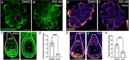 A–C, example live image of LysoTracker Red (green) to label synaptic vesicles in neuromasts at 5 dpf in wild‐type larva treated with 250 nm nocodazole (B) or DMSO control (A). The dashed box in each image indicates the hair cell magnified and outlined with a continuous line in C. D, quantification shows significantly less LysoTracker enrichment at the cell base in nocodazole‐treated larvae compared with DMSO control (control: 6.68 ± 1.43; nocodazole: 1.22 ± 0.37, n = 10 control and nocodazole neuromasts, unpaired t test, P < 0.0001). E–G, example immunolabel of Vglut3 to label synaptic vesicles in neuromasts at 5 dpf in larva treated with 250 nm nocodazole (F) or DMSO control (E). The dashed box in each image indicates the hair cell magnified and outlined with a continuous line in G. H, quantification reveals significantly less Vglut3 enrichment at the cell base in nocodazole‐treated larvae compared with DMSO controls (control: 5.75 ± 1.61; nocodazole: 2.53 ± 0.65, n = 8 control and nocodazole neuromasts, unpaired t test, P < 0.0001). The solid lines in the magnified images outline a single hair cell, with the base of the cell at the bottom of the image, and dashed boxes indicate example ROIs of the apical and basal regions used for quantification. n indicates nucleus. Scale bars in A and E = 5 µm and 2 µm in C and G.