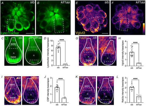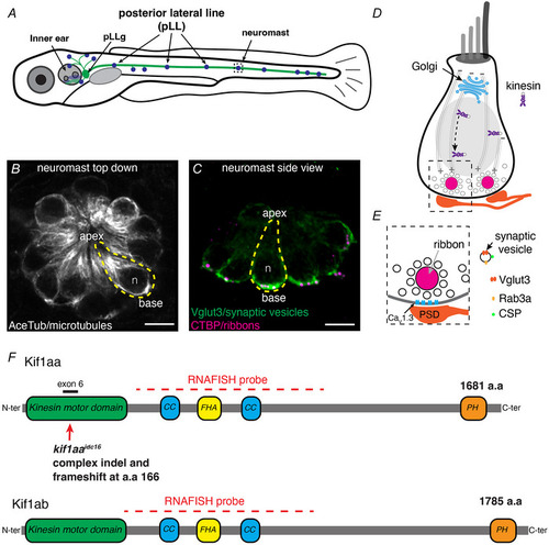 A, schematic of a larval zebrafish at 5 dpf. Hair cells are present in the inner ear and lateral line (blue). Hair cells are innervated by neurons in the posterior lateral‐line ganglion (pLLg) located near the inner ear (green). B–C, the lateral line is composed of clusters of hair cells called neuromasts (5 dpf). The apices of hair cells project from the centre of these clusters, while the ribbon synapses are located at the base of the cells. Neuromasts can be viewed from the top down (B) or from the side (C). An individual hair cell in B and C is outlined in yellow. Within hair cells, microtubule networks extend along the apical–basal axis (B). At the base of hair cells, synaptic vesicles (Vglut3 label, green) are enriched near the presynapse or ribbons (CTBP, magenta) (C). D, within hair cells, the Golgi is located above the nucleus (grey oval, n in B–C). The Golgi is where synaptic‐vesicle precursors are made de novo. Kinesin motors could be used to transport vesicles along microtubules to the cell base. E, synaptic vesicles surround the presynapse or ribbon in hair cells. Synaptic vesicles contain Rab3a, CSP and Vglut3. Beneath the ribbon CaV1.3 channels are clustered adjacent to the postsynaptic density (PSD). F, overview of the Kif1aa and Kif1ab proteins and major domains (coiled coil (CC), fork‐head associated (FHA), pleckstrin homology (PH)). The location of the germline kif1aa lesion in the kinesin motor domain within exon 6 is indicated. The red dashed line indicates the regions encompassed by the RNA‐FISH probe. The scale bar in B and C = 5 µm.