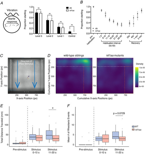 A, a vibrational‐acoustic tap stimulus was used to evoke an escape response in sibling control and kif1aa mutant larvae at three levels of decreasing intensity. Five stimuli per intensity level were administered, and the proportion of times each animal responded was plotted. No significant difference between kif1aa mutants and sibling controls was observed at any intensity tested (control: 0.78 ± 0.16 (Level 3), 0.51 ± 0.27 (Level 2), 0.25 ± 0.21 (Level 1), 0.08 ± 0.12 (no stimulus); kif1aa: 0.77 ± 0.18 (Level 3), 0.49 ± 0.24 (Level 2), 0.23 ± 0.14 (Level 1), 0 ± 0 (no stimulus); n = 38 control and 13 kif1aa larvae, two‐way ANOVA with multiple comparisons, P = 0.999 (Level 3–2), 0.994 (Level 1) and P = 0.586 for no stimulus control; 5 dpf). B, an acoustic startle habituation assay was used to assess whether kif1aa mutants respond to repeated stimuli. Here a series of 30 acoustic‐vibrational tap stimuli were delivered every 5 s. This assay shows that kif1aa mutants do not habituate or recover after habituation at a significantly different rate compared with sibling controls (n = 38 control and 25 kif1aa larvae, two‐way ANOVA with multiple comparisons, habituation: genotype × stimulus, P = 0.545 (and no significant difference at any interval); recovery: 40 s, P = 0.318; 1 min, P = 0.721; 2 min, P = 0.997). C, top‐down view of the working section of the microflume apparatus. Blue arrows indicate the direction of water flow. A larval fish performing behaviour is included for scale. D, two‐dimensional heat maps showing spatial use/cumulative positioning during flow stimulus. Wild‐type siblings (D) predominantly maintain position in the space at the front of the arena (white dotted lines) in the strongest part of the flow. Cumulative positioning in the source of the flow is reduced for kif1aa mutants (white vs. orange dotted lines), indicating impaired ability to station hold. E, box and whisker plots of total distance travelled during rheotaxis events. Under flow stimulus, the total distance travelled by kif1aa mutant larvae was significantly reduced compared with wild‐type siblings during the second half (11–20 s) of flow stimulus (control: 50.1 nm; kif1aa: 35.1 nm, adjusted P = 0.0170 (11–20 s)). F, box and whisker plots of the mean number of rheotaxis events. Under flow stimulus, kif1aa mutant larvae trended toward fewer rheotaxis events during the last half (11–20 s) of stimulus, though the difference was not significant (control: 4.5 events; kif1aa: 3.7 events, adjusted P = 0.0728). n = 43 wild‐type and 30 kif1aa mutant larvae were tested.