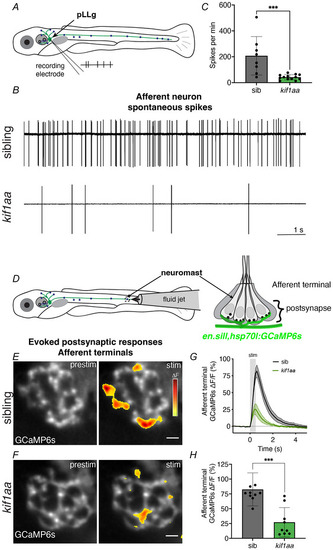 A, overview of the scheme used to record spontaneous spiking from afferent cell bodies in the posterior lateral‐line ganglion (pLLg). Glass pipettes pulled with long tapers were used to record extracellularly in a loose‐patch configuration. B, representative 10 s traces show spiking in pLLg neurons in sibling control (top) and kif1aa mutant (bottom). C, quantification shows that the average number of spikes per minute in kif1aa mutants is significantly lower than sibling controls (control: 208 ± 149, kif1aa: 42.0 ± 19.7; n = 8 control and 13 kif1aa cells, unpaired t test, P = 0.0007, 3–6 dpf). D, overview of the scheme used to assess evoked calcium responses in the afferent terminals beneath lateral‐line hair cells. A fluid jet is used to deliver flow stimuli to lateral‐line neuromasts. A transgenic line (en.sill,hsp70l:GCaMP6s) expressed in posterior lateral‐line afferents is used to measure fluid jet‐evoked GCaMP6s calcium signals in afferent terminals beneath neuromasts. E–F, top‐down images show optical planes of GCaMP6s in afferent terminals. Heatmaps show spatial representations of ∆ GCaMP signals in afferent terminals during a 500 ms stimulation (stim) compared with pre‐stimulus (prestim) in sibling control and kif1aa mutants. G, traces show the average response in the afferent terminal in sibling control and kif1aa mutants (n = 10 control and 9 kif1aa neuromasts). H, dot plot shows that the average response in the afferent terminal is significantly lower in kif1aa mutants compared with sibling control (control: 82.6 ± 27.9, kif1aa: 27.2 ± 24.7; n = 10 control and 9 kif1aa neuromasts, unpaired t test, P = 0.0003, 4–5 dpf). Scale bars in E,F = 5 µm and 1 s in B.
