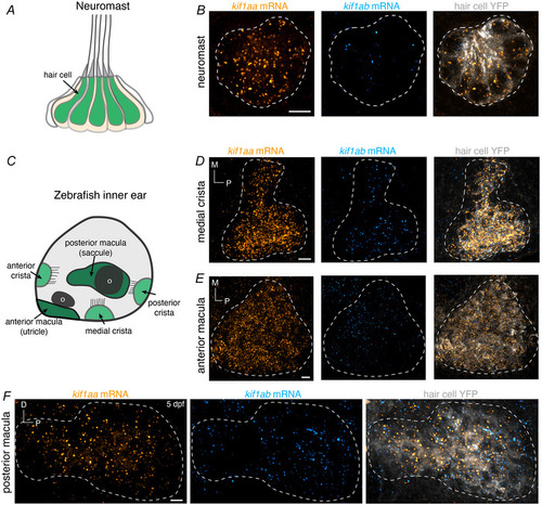 A,C, schematics showing a zebrafish neuromast and inner ear at 5 dpf. Within the inner ear, hair cells are present in three cristae and two maculae. Each macula is associated with an otolith (o). B, RNA‐FISH shows that at 5 dpf only kif1aa (orange) mRNAs are present in neuromast hair cells. D–F, in the inner ear, RNA‐FISH shows that at 5 dpf, both kif1aa (orange) and kif1ab (cyan) mRNAs are present in hair cells in cristae and maculae. The grey label is YFP, which is expressed specifically in hair cells by the transgenic line Tg(myo6b:Cr.ChR2‐EYFP). The YFP label was used to create the dashed line in B, D, E, F to outline the locations of hair cells within each sensory epithelium. Scale bars = 5 µm.