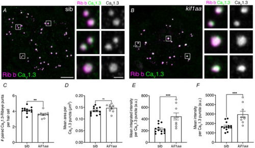 There are fewer paired Cav1.3‐Rib b puncta in kif1aa mutants