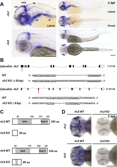 Generation of rfc2 KO and rfc5 KO zebrafish using CRISPR-Cas9. A: Expression of rfc2 or rfc5 mRNAs in zebrafish embryos at 2 dpf. Lateral and dorsal view, anterior is to the left. Both genes are expressed in mb, mhb, hb, and eyes. B: Schematic gene structure of zebrafish rfc2 and rfc5 with KO target sites (arrows), exon 1 of rfc2 and exon 3 of rfc5. Indel mutations include 20-bp insertion (+22 bp, −2 bp) in rfc2 (named rfc2ck179a) and 8-bp deletion in rfc5 (named rfc5ck171a). C: Predicted protein structure of each KO mutation, resulting in truncated proteins caused by frameshift. D: Loss of rfc2 or rfc5 mRNA expression in each KO zebrafish at 2 dpf. Dorsal view. n = 12 for rfc2 WT, n = 17 for rfc2 KO, n = 12 for rfc5 WT, and n = 9 for rfc5 KO. Scale bar, 200 μm (A and D). mb, midbrain; mhb, midbrain-hindbrain boundary; hb, hindbrain; WT, wild-type; KO, knockout; dpf, days post fertilization; AAA, AAA+ ATPase domain; Repl C, Replication factor C C-terminal domain; pa, pharyngeal arches; in, intestine.