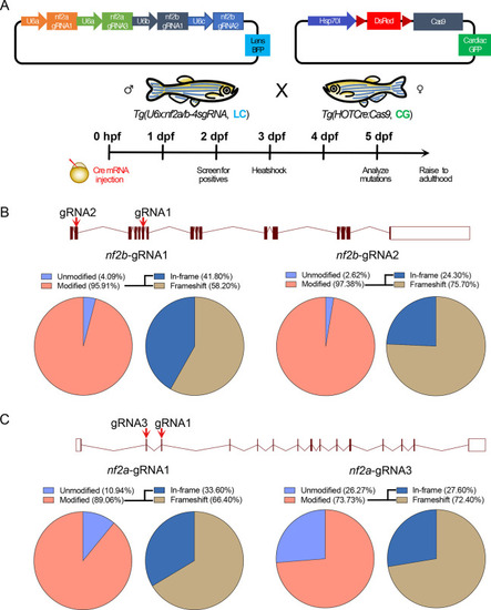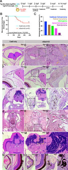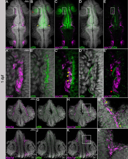 nf2a/b is expressed in the cranial neural crest cells and mesenchyme. (A,B,C,D,E) Multiplexed fluorescent mRNA in situ hybridizations by hybridization chain reaction (HCR) reveal expression of nf2b, nf2a and sox10 in whole-mount embryos at 1 dpf. (A′,B′,C′,D′,E′) Magnified images of the regions in the white dashed line boxes in A, B, C, D and E (yellow arrows indicate overlap of nf2b and sox10 expression; red arrows indicate the ectodermal epithelial cell), (F-H,I-K) nf2b, nf2a and foxc1a in cryo-sectioned embryos at 1 days post fertilization (dpf). (H′,K′) Magnified images of the regions in the white dashed line boxes in H and K, respectively (yellow arrowheads indicate overlap of nf2b and foxc1a expression). Images are representative of n=5 embryos. DAPI (gray) was used as a counterstain. Images in A, B, C, D and E represent maximum-intensity projections of whole-mount embryos and those in A′′, B′, C′, D′ and E′ represent confocal planes of 2.3 μm thickness. F-H and I-K are histological sections of 12 μm thickness imaged with Apotome. Red asterisk indicates the optic cup; yellow asterisks indicate the midbrain–hindbrain border.