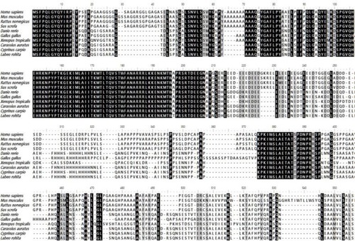 Multiple sequence alignment of IRX3 from different species. Multiple sequence alignments were conducted using Clustal Omega (www.ebi.ac.uk). The name of the species is given on the left side of the alignment and the number of amino acids in the peptide is provided above the alignment. The black background indicates conserved amino acid residues, and the dark gray background indicates similar amino acid residues. Species names and GenBank (www.ncbi.nim.nih.gov) Accession Numbers identification numbers used in the alignment are as follows; Homo sapiens IRX3 (NP_001382062.1), Mus musculus IRX3(NP_001240751.1), Rattus norvegicus IRX3 (NP_001382062.1), Sus scrofa IRX3 (XP_003127029.3) Xenopus tropicalis IRX3(AAH67972.1), Gallus gallus IRX3 (XP_040536955.1), Danio rerio IRX3 (NP_001307054.1), Carassius auratus IRX3 (XP_026123362.1) Cyprinus carpio IRX3 (XP_042583802.1), Labeo rohita IRX3 (XP_050969709.1). |