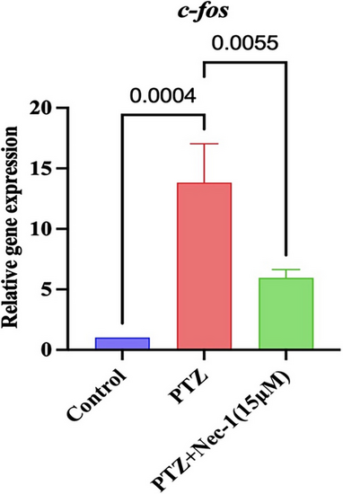 Effect of selective RIPK1 inhibitor (Nec-1) on neuronal marker (c-Fos) level in PTZ-stimulated epileptic zebrafish larvae (n = 50). The figure illustrates the inhibitory effect of Nec-1 on c-Fos expression in zebrafish exposed to PTZ. Results are expressed as mean ± SD, each performed in triplicate. Data were analyzed by one-way ANOVA, followed by Tukey’s post hoc test |