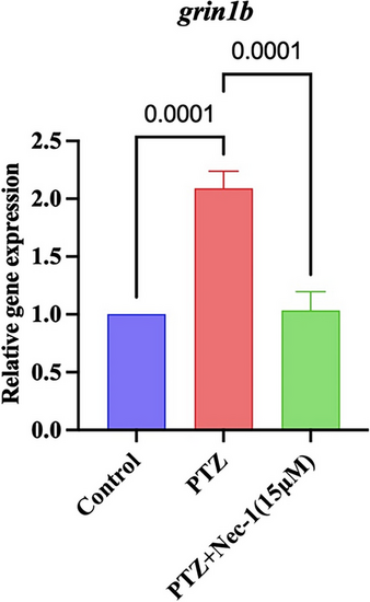 Effect of selective RIPK1 inhibitor (Nec-1) on GRIN1B expression in PTZ-stimulated epileptic zebrafish larvae (n = 50). The figure represents the suppressive effect of Nec-1 on GRIN1B gene expression in zebrafish larvae subjected to PTZ. Results are expressed as mean ± SD, each performed in triplicate. Data were analyzed by one-way ANOVA, followed by Tukey’s post hoc test |