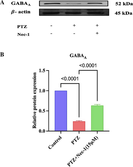 Quantification of GABAA receptor expression normalized to beta-actin. A Western blot analysis of GABAA B QuantitativeanalysesofGABAA. The figure illustrates the significant elevation in GABAA receptor expression in zebrafish larvae (n = 50) pretreated with Nec-1, indicating its potential as an anticonvulsant through modulation of TNFα/TNFR1 signaling. Results are expressed as mean ± SD, each performed in triplicate. Data were analyzed by one-way ANOVA, followed by Tukey’s post hoc test |