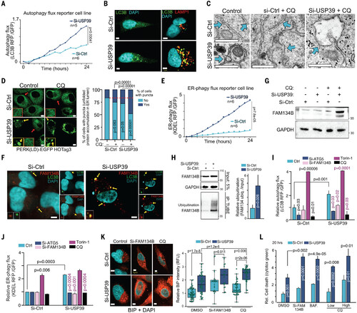 | ER-phagy activation alleviates CS-induced ER stress. (A) Macroautophagy flux quantification (IncuCyte S3) using ssRFP-GFP-LC3B in si-USP39 and si-Ctrl cells (data are means; si-Ctrl n = 6; si-USP39 n = 5; two-tailed t test). GFP, green fluorescent protein; RFP, red fluorescent protein. (B) Immunofluorescence against LC3B (green) and LAMP1 (red) in si-USP39 and si-Ctrl HeLa cells (n = 50; scale bars are 5 μm). See also fig. S9D. (C) TEM images of si-Ctrl and si-USP39 HeLa cells exposed to CQ (80 μm for 10 hours) (arrow indicates the ER; n = 10; scale bars are 500 nm). (D) Immunofluorescence images (left) and quantification (right) of puncta in si-Ctrl and si-USP39 PERK(LD)-EGFP-HOTag3 HeLa reporter cells exposed to CQ (100 μM for 10 hours) (red arrows indicate cells without puncta; yellow arrows indicate cells with puncta; the red dashed line in the graph indicates the percentage of cells with puncta for si-Ctrl cells; Fisher’s exact test; si-Ctrl n = 209, si-Ctrl+CQ n = 284, si-USP39 n = 202, and si-USP39+CQ = 249; scale bars are 7 μm). (E) ER-phagy flux quantification (IncuCyte S3) using ssRFP-GFP- KDEL in si-USP39 and si-Ctrl cells (data are means; n = 6; two-tailed t test). (F) LC3B (green) and FAM134B (red) immunofluorescence in si-USP39 and si-Ctrl HeLa cells (arrows indicate FAM134B/LC3B puncta; n = 10; scale bars are 5 μm). See also fig. S9, I and J. (G) Immunoblot against FAM134B and GAPDH in si-USP39 and si-Ctrl cells exposed to CQ (80 μM for 6 hours) (n = 3). (H) Immunoblot (left) and quantification of ubiquitinated FAM134B by tandem ubiquitin binding entities (TUBE) in si-USP39 and si-Ctrl cells (data are means ± SD; n = 3; two-tailed t test). (I) Macroautophagy flux quantification as in (A). Cells were exposed to 80 μM CQ or 250 ng/ml Torin-1 for 24 hours (data are means ± SD; n = 2, but for si-Ctrl and si-USP39, n = 4; two-tailed t test; black p values indicates versus si-Ctrl, and purple p values indicate versus si-USP39). (J) ER-phagy flux quantification as in (E). Cells were exposed to 80 μM CQ or 250 ng/ml Torin-1 for 24 hours (data are means ± SD; n = 2; two-tailed t test; black p values indicate versus si-Ctrl, and purple p values indicate versus si-USP39). (K) BiP immunofluorescence (red) (left) and quantification (right) under the indicated conditions (n = 50, but for si-FAM134B and si-FAM134B+si-USP39, n = 20; two-tailed t test; scale bars are 5 μm). Cells were exposed to CQ (80 μM) for 24 hours. For box-and-whisker plot, the center line represents the median, box limits are upper and lower quartiles, and whiskers are minimum and maximum values. (L) Cell death assay using cytotox green dye under the indicated conditions (data are means ± SD; n = 3; two-tailed t test). Cells were exposed to CQ (low, 40 μM; high, 80 μM), bafilomycin (200 nM/ml), and Torin-1 (250 ng/ml) for 20 hours. |