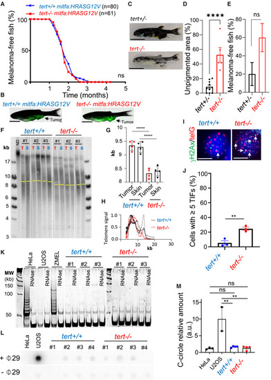 Melanoma initiation does not require a telomere maintenance mechanism (A and B) Incidence of melanoma of mitfa:HRAS fish is not affected by the lack of telomerase. (A) Percentage of tumor-free fish compared between tert+/+ and tert−/− fish (log rank test). (B) Representative images of 3-month-old tert+/+ and tert−/− fish with melanoma expressing GFP. Scale bars: 0.5 cm. (C–E) tert mRNA maternal contribution does not explain carcinogenesis in tert−/− fish. (C and D) Representative images and quantification of unpigmented skin area of mitfa:HRAS:GFP, tert+/− and tert−/− fish at 1.5 months of age. n(tert+/− = 10; tert−/− = 5); unpaired t test. Scale bars: 0.5 cm. (E) Quantification of fish with tumors at 1.5 months of age. n(tert+/− = 10; tert−/− = 5); χ2 test. (F–H) Even though telomere shortening is not apparent between skin and tumor in tert−/− fish, there is telomere shortening in tert−/− skin/tumor when compared to tert+/+ fish. However, tert−/− tumors possess higher DNA damage at telomeres. (F) Telomere restriction fragment (TRF) analysis by Southern blotting of tumor (T) and skin (S) genomic DNA extracted from 3-month-old fish (yellow bars represent mean telomere length) and (G) quantifications for mean telomere length and (H) densitometries of TRFs (n = 4; one-way ANOVA). (I) Images of γH2Ax/telG immunofluorescence in situ hybridization (immune-FISH) of tumor cells derived from tert+/+ and tert−/− 3-month-old fish. White arrows indicate telomere dysfunction-induction foci (TIFs) in tumor cells. Scale bars: 6 μm. (J) Percentage of cells containing ≥5 TIFs from (I) (n = 3; unpaired t test). (K–M) Early-stage melanoma do not display TMMs. (K) Telomerase activity evaluated by TRAP of tumor samples derived from tert+/+ and tert−/− 3-month-old fish (n = 3). Extracts from HeLa and ZMEL cells were used as positive controls and U2OS as a negative control. (L) C-circle assay of tumor samples derived from tert+/+ and tert−/− 3-month-old fish. Extracts from HeLa cells and U2OS were used as negative and positive controls, respectively. (M) Quantification of C-circle signal (n = 4; one-way ANOVA). Error bars represent ± SEM; each dot represents an individual tumor; ∗∗p ≤ 0.01 and ∗∗∗∗p ≤ 0.0001. ns, not significant. |