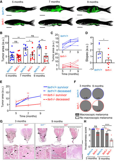 Absence of telomerase restricts tumor growth, leading to melanoma regression (A–D) Lack of telomerase impacts late tumor growth. (A) Examples of melanoma evolution over time of tert+/+ and tert−/− fish. Scale bars: 0.5 cm. (B) Quantification of tumor size of 5-, 7-, and 9-month-old tert+/+ and tert−/− fish (n ≥ 7; one-way ANOVA). (C) Evolution tumor size over time in individual animals (n = 6 and n = 7). (D) Slope of tumor size evolution calculated using linear regression of three time points (n ≥ 6; unpaired t test). (E) Larger tumors are associated with tert−/− fish lethality. Tumor size evolution of fish that either survived until 9 months (solid line: survival group) or died after 7 months (dashed line: non-survivor group). Statistics compare tert−/− survivors with tert−/− deceased fish at 7 months (n ≥ 7; unpaired t test). (F–H) Melanoma regresses in fish lacking telomerase. (F) tert+/+ and tert−/− fish with macroscopic tumors at 3 and 9 months of age. (G) Histopathology analysis of melanoma of 3- and 9-month-old tert+/+ and tert−/− zebrafish. Tumors are indicated by a black arrowhead and dashed line. Higher magnification shows infiltrative features of melanoma (black arrowhead), with marked invasion, destruction, and replacement of the hypaxialis muscle (white arrowhead). Top scale bar: 500 μm, bottom scale bar: 200 μm. (H) Quantification of melanoma invasiveness: (1) non-invasive, (2) minimally invasive, and (3) invasive (n ≥ 5; one-way ANOVA). Error bars represent ± SEM; each dot represents an individual tumor; ∗p ≤ 0.05, ∗∗p ≤ 0.01, ∗∗∗p ≤ 0.001, and ∗∗∗∗p ≤ 0,0001. ns, not significant; a.u., arbitrary units. |