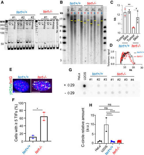 Telomerase is re-activated in late-stage melanoma, and its absence causes telomere shortening (A–D) Telomerase is active in tumors of 9-month-old fish and telomere shortening occurs in tert−/− tumors. (A) Telomerase activity evaluated by TRAP in tumor samples derived from tert+/+ and tert−/− 9-month-old fish (n = 3 and n = 2, respectively). (B) Telomere restriction fragment (TRF) analysis by Southern blotting of tumor (T) and skin (S) genomic DNA extracted from 9-month-old fish (yellow bars represent mean telomere length) and (C) quantifications for mean telomere length and (D) densitometries of TRFs (n ≥ 2; one-way ANOVA). (E) Images of γH2Ax/telG immune-FISH of tumor cells derived from tert+/+ and tert−/− 9-month-old fish. White arrows indicate telomere dysfunction-induction foci (TIFs) in tumor cells. Scale bars: 6 μm. (F) Percentage of cells containing ≥5 TIFs from (B) (n = 2; unpaired t test). (G and H) Late melanoma in tert−/− fish do not engage ALT as TMM. (G) C-circle assay of tumor samples derived from tert+/+ and tert−/− 3-month-old fish. Extracts from HeLa cells and U2OS were used as negative and positive controls, respectively. (H) Quantification of C-circle signal (n ≥ 7; one-way ANOVA). Error bars represent ± SEM; each dot represents an individual tumor; ∗p ≤ 0.05, ∗∗p ≤ 0.01, and ∗∗∗∗p ≤ 0.0001. ns, not significant. |