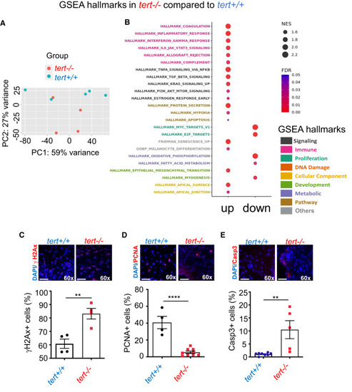 Lack of telomerase leads to low proliferation and increased apoptosis, inflammation, and melanocyte differentiation (A) Principal-component analysis (PCA) based on untargeted transcriptomics data of tumors from 9-month-old fish. (B) Gene set enrichment analysis (GSEA) hallmarks of late-stage melanoma of tert−/− fish compared to tert+/+ highlighting inflammatory pathways, senescence, and melanocyte differentiation. (C–E) Representative immunofluorescence images and respective quantifications of tert+/+ and tert−/− tumors. Scale bars: 20 μm. (C) DNA damage by γH2AX, (D) proliferation by PCNA, and (E) apoptosis by cleaved caspase-3 immunofluorescence of 9-month-old fish tumors (n ≥ 4; unpaired t test). Error bars represent ± SEM; each dot represents an individual tumor; n ≥ 4; ∗p ≤ 0.05, ∗∗p ≤ 0.01, and ∗∗∗∗p ≤ 0.0001. |