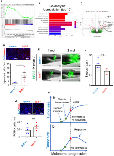 The immune system restrains growth of telomerase-deficient melanoma Telomerase-deficient tumors are strongly immunogenic. (A) Allograft rejection enrichment plot. (B) Gene Ontology (GO) enrichment analysis for upregulated genes of late-stage melanoma of tert−/− fish compared to tert+/+. (C) Volcano plot of differentially expressed genes of late-stage melanoma of tert−/− fish compared to tert+/+, highlighting genes included in leukocyte migration pathway from the GO analysis. (D) Immunofluorescence images and quantifications of immune cell infiltrates (L-plastin) of late-stage melanoma. Late-stage tert−/− melanoma is able to proliferate and grow in immunocompromised fish (n ≥ 4; unpaired t test). Scale bars: 20 μm. (E) Images of immunocompromised zebrafish (prkdc−/−) engrafted with primary melanoma cells derived from 9-month-old zebrafish at 1 and 2 months post-injection (mpi). Scale bars: 0.5 cm. (F) Progression slope of tumor area calculated by a linear regression of two time points (1 and 2 mpi) (n ≥ 4; unpaired t test). (G) Cell proliferation of tumor cells quantified using PCNA immunofluorescence (n ≥ 4; unpaired t test). Scale bars: 20 μm. (H) We propose that melanoma can initiate and progress without telomerase activation. However, once telomeres become critically short, cancer cells must activate telomerase to sustain proliferation at later stages (a). If they fail to do so, tumor growth stagnates, leading to tumor regression (b). Error bars represent ± SEM; each dot represents an individual tumor; ∗p ≤ 0.05. ns, not significant. |