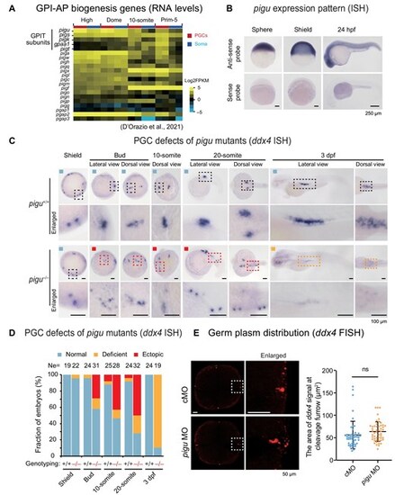 PGC migration defects in tsu419 mutant embryos. (A) Heatmap showing expression levels (D'Orazio et al., 2021) of genes involved in GPI-AP biogenesis, including subunits in the GPIT complex. Soma, somatic cells. (B) ISH of pigu in WT embryos at the sphere, shield, and 24 hpf stages with anti-sense and sense probes, respectively. Scale bar, 250 μm. (C) ddx4 ISH showing PGC locations in pigu+/+ and pigu–/– embryos at the 4-cell, shield, bud, 10-somite, 20-somite, and 3 dpf stages. Scale bar, 100 μm. The dashed boxed areas were enlarged for a better view. Black, red, and orange boxes indicate the region for normal, ectopically located, and deficient ddx4 signal PGCs, respectively. (D) The ratios of embryos in C with normal (blue), ectopically located (red), and deficient ddx4 signal (orange) PGCs. Ne, number of embryos. (E) Left, FISH of ddx4 in control MO (cMO)- and pigu MO-injected embryos at the 4-cell stage, respectively. Scale bar, 50 μm. Right, scatter plot showing the area of ddx4 signals (indicating germ plasm) at cleavage furrow (as shown in left). The numbers of regions detected are 49 in control and 51 in pigu morphants, respectively. ns, not significant, P > 0.1. |