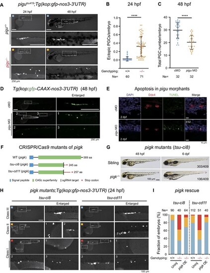GPIT complex is required for PGC migration. (A) Fluorescence images showing the PGCs in pigu+/+ and pigu–/–embryos by the crossing with Tg(kop:gfp-nos3-3′UTR) transgenic line. The dashed boxed areas were enlarged for better review. Scale bar, 250 μm. (B) Fraction of ectopic PGCs to total PGCs per embryo in embryos in A at 24 hpf. Ne, number of embryos. ****P < 0.0001. (C) Scatter plot showing the total numbers of PGCs per embryo in cMO- and pigu MO-injected embryos at 48 hpf. (D) Fluorescence images showing kop:gfp signals (PGCs) in cMO- and pigu MO-injected embryos at 48 hpf. Scale bar, 250 μm. (E) Fluorescence images showing cMO- and pigu MO-injected embryos at 12-somite and 2 dpf stages with the TUNEL assay (green) and Ddx4 immunostaining (red), respectively. DAPI, DNA, blue. Scale bar, 10 μm. (F) Schematic showing protein structures of WT and two pigk mutant lines, tsu-ci8 and tsu-cd11. (G) Morphology of pigk mutant embryos at 48 hpf and 6 dpf. The ratios of embryos are shown in the picture. Scale bar, 100 μm. (H) Fluorescence images showing the PGCs in pigktsu-ci8 and pigktsu-cd11 embryos by the crossing with Tg(kop:gfp-nos3-3′UTR) transgenic line in class I (red), class II (orange), and class III (blue), which indicate severe and mild defective and normal PGC migration, respectively. The dashed boxed areas were enlarged for better review. Scale bar, 100 μm. (I) The ratios of embryos in class I (red), class II (orange), and class III (blue) in uninjected WT, pigk mutant, and 200 pg WT pigk mRNA-injected pigk mutant embryos. |