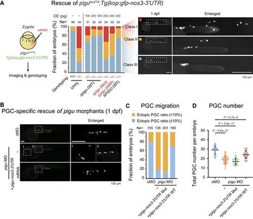 Pigu in somatic cells is involved in PGC migration regulation. (A) Left, schematic showing the strategy of the rescue experiment. Right, bar plot showing the ratios of embryos in classes I, II, and III in the rescue experiment. OE (pg), the dosage of mRNA injection. Representative fluorescence images are shown on the right. (B) Fluorescence images showing signals of PGCs in embryos injected with cMO, pigu MO, or pigu MO and pigu-nos3-3′UTR mRNA at 1 dpf. Scale bar, 150 μm. (C) Bar plot showing the ratios of embryos with normal (blue) and ectopic (orange) PGCs. (D) Scatterplot showing the total numbers of PGCs per embryo in embryos injected with cMO (blue), pigu MO (orange), pigu MO and mutant pigu-nos3-3′UTR mRNA (green), or pigu MO and WT pigu-nos3-3′UTR mRNA (red) at 1 dpf. |