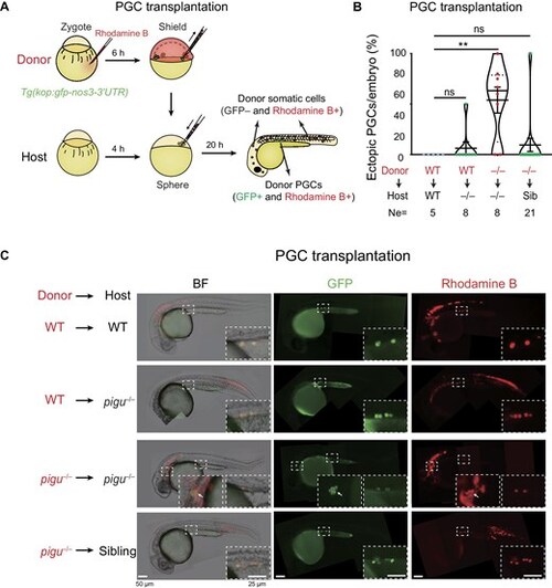 Defective PGC migration in pigu mutants is caused by the loss of Pigu in both PGCs and somatic cells. (A) Schematic showing PGC transplantation. (B) The ratios of ectopic PGCs to total transplanted PGCs per embryo in four PGC transplantation pairs. Ne, the number of transplanted embryos. Sib, sibling. –/–, pigu–/–. **P < 0.01. (C) Fluorescence images showing host embryos with successfully transplanted PGCs. BF, bright field. GFP, labeling PGCs. Rhodamine B, labeling donor cells. The dashed boxed areas were enlarged for better review. The arrows indicate ectopically located PGCs. |