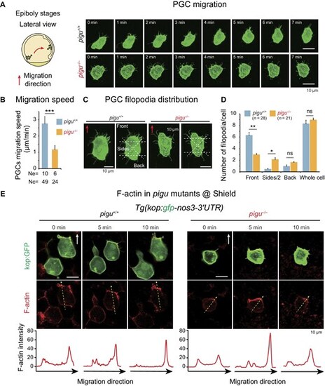 Filopodia dynamics of PGCs in pigu mutants. (A) Left, schematic showing PGC migration in embryos at epiboly stages. The red arrow indicates the PGC migration direction. Right, fluorescence images showing individual pigu+/+ and pigu–/–PGCs during migration at the epiboly stage. Scale bar, 10 μm. (B) Cell migration speed of pigu+/+ and pigu–/– PGCs. Ne, number of embryos. Nc, number of cells. (C) Fluorescence images showing the region classification in statistical analysis of the filopodia distribution in pigu+/+ and pigu–/–PGCs. Red arrow, the orientation of PGC migration. Scale bar, 10 μm. (D) Bar plot showing filopodia distributions in pigu+/+ and pigu–/– PGCs. Data are presented as mean + standard error of the mean. ns, not significant, P > 0.05; *P < 0.05; **P < 0.01. (E) Fluorescence images showing migrating PGCs with GFP labeling (green) and F-actin (red) in pigu+/+ and pigu–/–embryos. White arrow, the orientation of PGC migration. Scale bar, 20 μm. The curve plots below showing the quantitative of F-actin signals. |
