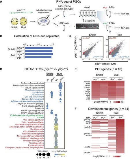 Transcriptome analysis of PGCs in WT and pigu mutant embryos. (A) Schematic showing sample collection for RNA-seq of PGCs. (B) Correlations between replicates of pigu+/+ and pigu–/–PGCs at the shield and bud stages. (C) Differentially expressed genes (DEGs) between pigu+/+ and pigu–/–PGCs at the shield and bud stages. Red, upregulated genes. Blue, downregulated genes. (D) GO analysis of DEGs from pigu–/–vs. pigu+/+ PGCs. (E and F) PGC-specific gene (E) and developmental gene (F) expression levels in pigu+/+ (blue) and pigu–/–(red) PGCs at the shield and bud stages. |