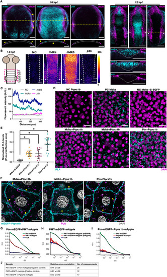 | Expression and interaction of zebrafish Mdka, Mdkb and Ptn with Ptprz1b. (A) Hybridization chain reaction RNA in situ hybridization (HCR) of mdka, mdkb and ptn expression in wildtype embryos at 10 hpf (neural plate stage) and 12 hpf (early neural keel stage). Upper panels are representative maximum-intensity-projection (MIP) dorsal views with dlx3b (magenta) demarcating the neural plate/keel boundary. Arrow heads indicate mdka and mdkb expression (cyan) at 10 hpf. The lower panels are reconstructed orthogonal views from the position indicated by yellow dashed lines in the upper panels. The outlines of neural plate/keel are marked by white dashed lines, and otic vesicles flanking r5 are labelled with white asterisks. Scale bars = 50 μm. (B) Fluorescent RNA in situ hybridization (FISH) of mdka, mdkb and ptn expression in wildtype embryos at 14 hpf. Left: Schematic diagram of hindbrain organization, dorsal view with dashed box indicating rhombomere region (r1 to r6) analyzed by FISH. NC = negative control (mdka sense probe). Representative MIP images showing dorsal views and pseudo-colored in fire LUT with an intensity range from 0 to 255 by ImageJ. Dashed lines delineate lateral edges of rhombomeres, white asterisks indicate position of otic vesicles at r5. Scale bars = 50 μm. (C) Mean fluorescent intensity of FISH signals in (B) along anteroposterior axis of r1 to r6. (D) Representative MIP images after proximity ligation assay (PLA) of controls and different pairs of ligands (Mdka, Mdkb, Ptn) and receptor (Ptprz1b). Embryos injected with HA-ptprz1b mRNA alone served as the negative control (NC). Positive controls (PC) are mdka-MYC mRNA-injected embryos using two pairing secondary antibodies that recognize the same primary antibody. Embryos co-injected with mdka-MYC and secreted EGFP (secEGFP) mRNA served as random collision controls. PLA signals are represented in cyan, and DAPI in magenta. Scale bars = 20 μm. (E) Statistical analysis of PLA levels normalized to DAPI signals after thresholding (PLA/DAPI area ratios). Data are presented as scattered dots with mean ± SD. Statistical analysis was performed on Estimation Stats (https://www.estimationstats.com) to compare each dataset with the random collision control. P values are calculated from a two-sided permutation t-test under a CI of 95% and listed in Fig. S1G. Asterisks indicate statistical significance (P < 0.05). (F) Representative super resolution single plane images of PLA signals from Mdka-MYC/Mdkb-MYC/Ptn-MYC and mEGFP-Ptprz1b, respectively. mEGFP-Ptprz1b is colored in cyan, PLA in magenta, and DAPI in gray. PLA signals on plasma membrane are indicated by yellow arrowheads. Scale bars = 20 μm. (G-J) FCCS measurements were performed on MZ ptprz1b embryos at 4 hpf that had been injected with the indicated mRNAs at 1-cell stage. Green and red curves are auto-correlation functions plotted from green and red fluorophore channels, respectively. Blue curves represent the cross-correlation function. All curves were fitted by a 3D-2 particles model as represented by black curves, respectively. (G) MZ ptprz1b mutant embryos expressing Ptn-mEGFP and PMT-mApple were used as negative control. (H) MZ ptprz1b mutant embryos expressing membrane bound PMT-mEGFP-mApple were used as positive control. (I) Data obtained from MZ ptprz1b embryos that were co-injected with ptn-mEGFP and ptprz1b-mApple mRNA. The relative cross-correlation values of FCCS measurements are shown in (J) in the form of mean ± SD. (For interpretation of the references to colour in this figure legend, the reader is referred to the Web version of this article.) |