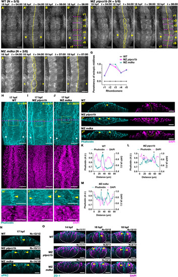 | MZ ptprz1b, MZ mdka and MZ ptn mutants exhibit transient ectopic midline formation in rhombomeres. (A-B) Representative MIP still images in dorsal views taken from confocal time-lapse analysis at 4 and 6 h of time-lapse showing normal midline formation in rhombomeres of WT embryos. Imaging was done from approx. 12 hpf with 4 min intervals. PMT-mEGFP was injected to mark cell membranes. Elapsed time (t) is displayed as hours:minutes (hh:mm). Midline structures are delineated by yellow dotted lines. Magenta dashed lines delineate rhombomere boundaries. Asterisks label position of otic vesicles at r5. Scale bar = 50 μm. (C-D) Transient ectopic midline in MZ ptprz1b mutant labelled by PMT-mEGFP. Scale bar = 50 μm. (E-F) Transient ectopic midline in MZ mdka mutant labelled by PMT-mApple. Still images taken from confocal time-lapse analysis at 4 and 7 h. Scale bar = 50 μm. (G) Quantification of penetrance of ectopic midline phenotype in each rhombomere in WT (N = 5), MZ ptprz1b (N = 6) and MZ mdka (N = 6). Data were acquired from three independent experiments. The penetrance of ectopic midlines is calculated by dividing the number of embryos with ectopic midlines in each rhombomere by the total number of embryos. (H-J) Representative MIP images of Phalloidin stained F-actin (cyan) and DAPI stained nuclei (magenta) in rhombomere region of WT, MZ ptprz1b and MZ mdka mutant embryos at 17 hpf. Yellow dashed boxes indicate region shown in (H′-J′), and magenta dashed lines indicate the position of reconstructed orthogonal views shown in (H″-J″). Scale bar = 50 μm (H-J) and 30 μm (H′-J′, H″-J″). Arrowheads indicate F-actin accumulation. (K-M) Respective mean fluorescent intensity histograms of Phalloidin (cyan) and DAPI (magenta) along left-right axis of (H′-J′). Asterisks highlight aggregation of Phalloidin-stained F-actin. (N) Representative reconstructed orthogonal views of aPKCζ (cyan) immunostaining in WT, MZ ptprz1b and MZ mdka mutant at 17 hpf. Views are taken from r2 at comparable positions. Yellow arrowheads indicate aggregation of aPKCζ, respectively. Scale bar = 30 μm (O) Representative reconstructed orthogonal views after ZO-1 (cyan) and DAPI (magenta) staining in WT, MZ ptprz1b and MZ mdka mutant at 14, 16 and 18 hpf. Images are taken from r2 at comparable positions. Accumulation of ZO-1 is indicated by yellow arrowheads, and neural keel/rod is demarcated by white dashed lines. Scale bar = 30 μm. (For interpretation of the references to colour in this figure legend, the reader is referred to the Web version of this article.) |