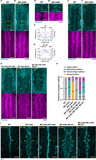 | A mutation in mdkb rescues midline defects in MZ mdka mutants. (A-B) Representative MIP images of Phalloidin (cyan) and DAPI (magenta) stained WT and MZ mdkb mutant embryos at 17 hpf. Distinctive F-actin accumulation in medial region of WT (A), in contrast to MZ mdkb mutants (B). Nuclei distribution was similar in WT and MZ mdkb mutants (lower images). Positions of otic vesicles are labelled by white asterisks. Yellow dashed boxes indicate regions shown with higher magnification in (A′-B′). Scale bars = 50 μm (A-B) and 30 μm (A′-B′). (C-D) Quantification of mean fluorescent intensity of Phalloidin (cyan) and DAPI (magenta) along left-right axis of (A′-B′). Asterisks show the accumulation of Phalloidin-stained F-actin. (E-F) At 18 hpf, distinctive F-actin accumulation was found in both WT and MZ mdkb mutant embryos. The positions of otic vesicles are indicated by asterisks. Scale bars = 50 μm. (G) Representative MIP images of Phalloidin stained F-actin (cyan) and DAPI stained nuclei (magenta) in rhombomere region of WT, MZ mdka; MZ mdkb, MZ mdka; MZ ptn double mutant and MZ mdka; MZ mdkb; MZ ptn triple mutant embryos at 17 hpf. Yellow arrowheads indicate F-actin accumulation at a single midline in WT and MZ mdka; MZ mdkb mutants and at ectopic midlines in MZ mdka; MZ ptn double and MZ mdka; MZ mdkb; MZ ptn triple mutants. Scale bar = 50 μm. (H) Categorization of midline phenotypes in WT, MZ mdka, MZ mdkb, MZ mdka; MZ mdkb, MZ mdka; MZ ptn and MZ mdka; MZ mdkb; MZ ptn mutants. Data of WT and MZ mdka was also shown in Fig. 2H–J. (I) Representative MIP dorsal views after ZO-1 (cyan) staining in WT, MZ mdka, MZ mdka; MZ mdkb, MZ mdka; MZ ptn and MZ mdka; MZ mdkb; MZ ptn mutants at 17 hpf. Accumulation of ZO-1 is indicated by yellow arrowheads. Scale bar = 50 μm. (For interpretation of the references to colour in this figure legend, the reader is referred to the Web version of this article.) |