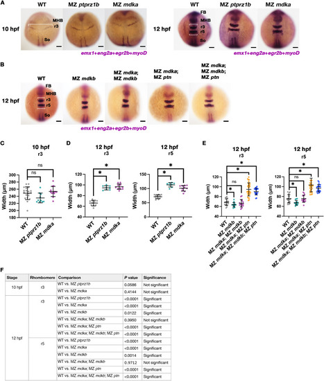 | MZ ptprz1b and MZ mdka mutants exhibit delayed neural keel convergence. (A-B) Whole-mount in situ RNA hybridization of WT, MZ ptprz1b and MZ mdka embryos at 10 and 12 hpf, and MZ mdkb, MZ mdka; MZ mdkb, MZ mdka; MZ ptn and MZ mdka; MZ mdkb; MZ ptn mutant embryos at 12 hpf. The maximum width of forming r3 and r5 is measured (white bar) using egr2b as a marker. Forebrain, mid-hindbrain boundary and somites are labelled by emx1, eng2a and myoD as landmarks, respectively. (C-F) Quantification of maximum width of r3 at 10 hpf (C) and r3 and r5 at 12 hpf (D-E). Data are presented as scattered dots. Mean ± SD of each dataset is indicated by line and error bar. Statistical comparison was performed between WT (N = 19, 10 hpf; N = 10, 12 hpf) and MZ ptprz1b (N = 10, 10 hpf; N = 8, 12 hpf) or MZ mdka (N = 13, 10 hpf; N = 10, 12 hpf) and between WT (N = 20, 12 hpf) and MZ mdkb (N = 15, 12 hpf), or MZ mdka; MZ mdkb (N = 15, 12 hpf) or MZ mdka; MZ ptn (N = 30, 12 hpf) or MZ mdka; MZ mdkb; MZ ptn (N = 20, 12 hpf) on Estimation Stats (https://www.estimationstats.com). P values calculated by two-sided permutation t-tests under a CI of 95% are shown in (F). Asterisks indicate statistical significance (P < 0.05). |