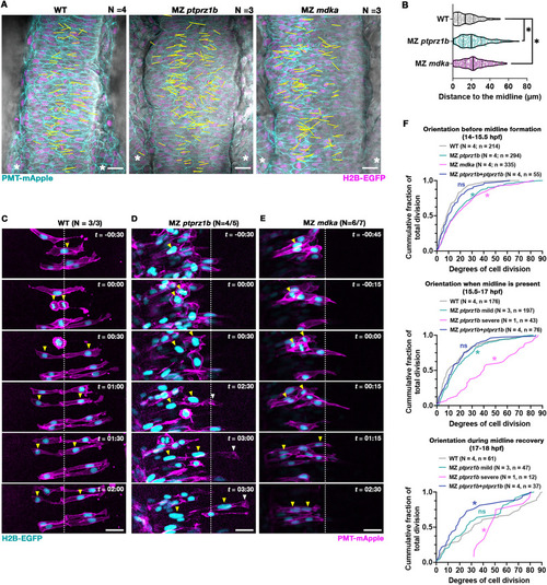| MZ ptprz1b and MZ mdka mutant cells show misplaced C-divisions and a failure in contralateral intercalation. (A) Representative single-plane still images (dorsal views) taken from time-lapse movies of WT (N = 4), MZ ptprz1b (N = 3) and MZ mdka mutants (N = 3). PMT-mApple (cyan) labels cell membranes, H2B-EGFP (magenta) marks nuclei and DIC is shown in gray. Yellow lines indicate XY-position and direction of C-divisions superimposed from Z-planes and timepoints of interests. Lines are drawn by linking the respective middle points of two separating pairs of chromosomes at telophase. Scale bar = 20 μm. (B) Quantification of relative distances of C-divisions to middle of neural keel in WT (N = 4), MZ ptprz1b (N = 3) and MZ mdka mutants (N = 3) mutants. A total of 215, 201 and 269 C-division events were identified and analyzed in WT, MZ ptprz1b and MZ mdka single mutants, respectively. Data are presented as truncated violin plots, where center lines represent the median and limits show the first and third quartiles, respectively. Each scatter dot indicates a C-division event. Statistical analysis was performed using Estimation Stats (https://www.estimationstats.com), between WT and MZ ptprz1b or MZ mdka with a CI of 99%. (C-E) Representative C-division events in WT (C), MZ ptprz1b (D) and MZ mdka (E) mutants. Cells were mosaically labelled with H2B-EGFP (cyan) and PMT-mApple (magenta) by injecting mRNAs into single cells at 32-cell stage. Timelapse acquisition started at 14–15 hpf, and time (t) is indicated as hours:minutes (hh:mm). White dashed lines label presumptive midline of neural keel. Yellow arrowheads indicate nuclei position of cells during C-division. Mutant cell that crosses the presumptive midline after C-division is labelled with white arrowhead. Scale bar = 20 μm. (F) Quantification of relative angles of cell divisions to mediolateral axis in WT (N = 4), MZ ptprz1b (N = 4), and MZ mdka mutants (N = 4), and in MZ ptprz1b single mutants with mosaic overexpression of ptprz1b-mApple mRNA (N = 4). Divisions horizontal to mediolateral axis are defined as 0°, while divisions perpendicular to mediolateral axis are defined as 90°. Data were categorized into three periods, period before the midlines formed (14–15.5 hpf), period when midline or ectopic midlines were present (15.5–17 hpf), and the period when ectopic midlines started to merge (17–18 hpf). Data are presented as cumulative frequency graph with numbers of samples (N) and numbers of divisions (n) listed. Kolmogorov-Smirnov tests were performed with a CI of 95% to compare the mean between WT (N = 4) and MZ ptprz1b (N = 4), MZ mdka (N = 4) or MZ ptprz1b overexpressing ptprz1b-mApple (N = 4) and between WT (N = 4) and MZ ptprz1b with mild midline defects (N = 3), MZ ptprz1b with severe midline defects (N = 1) or MZ ptprz1b overexpressing ptprz1b (N = 4). Calculated P values are listed in Fig. S6F. Asterisks indicate statistical significance between samples and WT, respectively (P < 0.05). (For interpretation of the references to colour in this figure legend, the reader is referred to the Web version of this article.) |