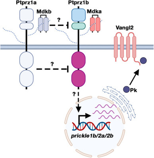 | Hypothetical model of signalling crosstalk between Mdka-Ptprz1b and the noncanonical Wnt/PCP pathway. Mdka-Ptprz1b signalling facilitates transcription of prickle1b, prickle2a and prickle2b to contribute to Wnt/PCP signalling. Mdkb acts as an antagonist of Mdka-Ptprz1b signalling likely through competing with Mdka for Ptprz1b binding to prevent receptor activation or by inducing receptor dimer formation to inhibit intracellular protein tyrosine phosphatase activity |