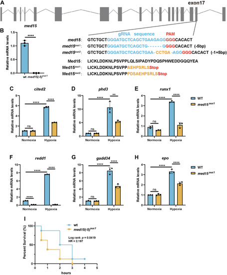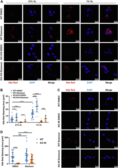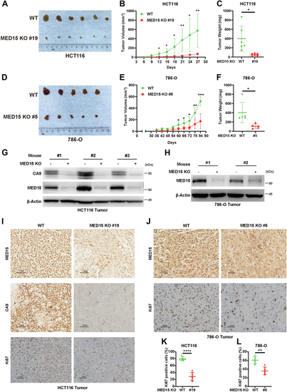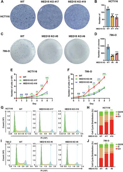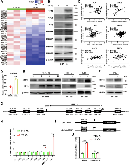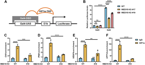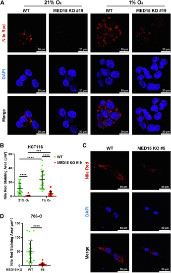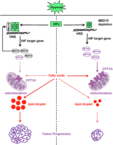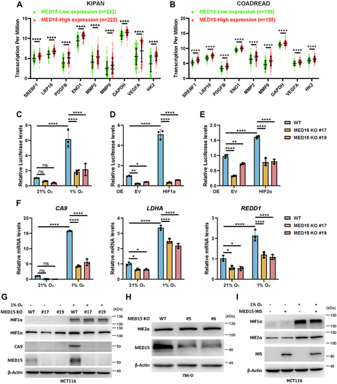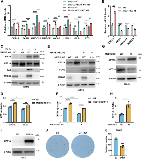 Knocking out MED15 activates the expression of CPT1A.A, RT-qPCR analysis of the mRNA levels of CPT1A, FASN, HMGCS1, HMGCR, MCAD, LIPIN1, GLS1, and ATGL in WT or MED15 KO (KO #19) HCT116 cells exposed to 21% O2 or 1% O2 for 72 h. Data are represented as means ± SD. n = 3 biologically independent extracts. ∗p < 0.05, ∗∗p < 0.01, ∗∗∗p < 0.0001, ∗∗∗∗p < 0.0001 by two-way ANOVA with Tukey's multiple comparisons test. B, RT-qPCR analysis of the the mRNA levels of CPT1A, FASN, HMGCS1, and HMGCR in WT or MED15 KO (KO #5) 786-O cells. Data are represented as means ± SD. n = 3 biologically independent extracts. ∗∗p < 0.01, ∗∗∗∗p < 0.0001 by Student's t test. C and D, Western blot of indicated proteins in WT or MED15 KO (KO #19) HCT116 cells exposed to 21% O2 or 1% O2 for 72 h (C). Relative intensities of CPT1A were quantified (D). Data are represented as means ± SD. n = 3 biologically independent extracts. ∗p < 0.05, ∗∗p < 0.01 by two-way ANOVA with Tukey's multiple comparisons test. E and F, Western blot of indicated proteins in WT or MED15 KO (KO #19) HCT116 cells transfected with EV (−) or HIF1α-3 × FLAG (+) (E). Relative intensities of CPT1A were quantified (F). Data are represented as means ± SD. n = 3 biologically independent extracts. ∗∗∗∗p < 0.0001 by two-way ANOVA with Tukey's multiple comparisons test. G and H, Western blot of indicated proteins in WT or MED15 KO (KO #5) 786-O cells (G). Relative intensities of CPT1A were quantified (H). Data are represented as means ± SD. n = 3 biologically independent extracts. ∗∗p < 0.01 by Student's t test. I, Western blot assay of CPT1A confirmed that CPT1A protein level significantly upregulated after stable overexpression of CPT1A. J and K, colony formation assay of 786-O with stable overexpression of EV or CPT1A. Cells were cultured for 9 days. Representative images from three independent experiments are shown in (J). Quantification of colony numbers is shown in (K). Data are represented as means ± SD. n = 3 biologically independent repeats. ∗∗∗p < 0.001 by Student's t test. ATGL, adipose triglyceride lipase; CPT1A, carnitine palmitoyltransferase 1A; FASN, fatty acid synthase; EV, empty vector; GLS1, glutaminase 1; HIF, hypoxia-inducible factor; HMGCS1, 3-hydroxy-3-methylglutaryl-CoA synthase 1; HMGCR, 3hydroxy-3methylglutaryl-coenzyme A reductase; MCAD, medium-chain specific acyl-CoA dehydrogenase; MED15, Mediator complex subunit 15; ns, not significant.