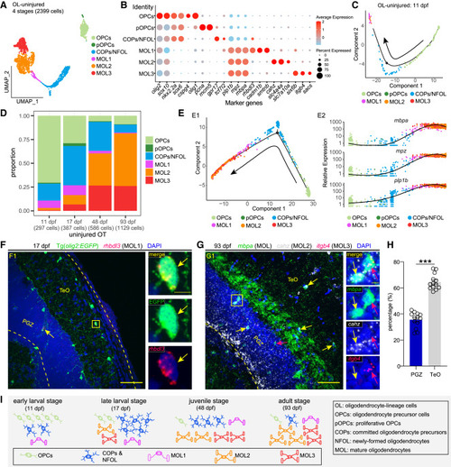 Temporal heterogeneity of oligodendrocyte-lineage cells under the physiological condition (A) UMAP plot showing re-clustering of oligodendrocyte-lineage cells (OL) from the uninjured OT across stages. Cells are colored by their identities. (B) Dot plot showing the expression of marker genes of each annotated cell type/subtype in (A). (C) Pseudo-time trajectory of OL in 11-dpf uninjured OT. (D) Histograms showing the proportion of each OL type/subtype at each stage. (E) Pseudo-time trajectories of OL from the uninjured OT across stages (E1) and the expression of myelin proteins along the trajectories (E2). (F) rhbdl3 in situ hybridization (red) combined with EGFP immunostaining (green) on the midbrain section of Tg(olig2:EGFP) at the late-larval stage (17 dpf). Yellow arrows indicate the rhbdl3+EGFP+ MOL1. (G) RNAscope of mbpa (green), cahz (white), and itgb4 (red) on the midbrain section of zebrafish at the adult stage (93 dpf). Yellow arrows indicate the cahz+mbpa+ MOL2, while red arrows indicate the itgb4+mbpa+ MOL3. (H) Relative ratio of cahz+mbpa+ MOL2 located in the TeO or PGZ of OT at 93 dpf in (G). (n = 13 sections/4 animals; mean ± SEM; parametric paired t tests; ∗∗∗p < 0.001). (I) Schematic illustration of oligodendrocyte-lineage cellular composition in uninjured OT across stages. In (F) and (G), dashed lines indicate OT boundaries. Boxed areas are shown magnified in the right panels. Scale bars, 50 μm (F1 and G1) and 5 μm (zoom-in images). Nuclei are visualized by DAPI (blue). |
