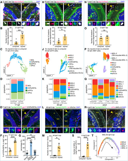 TBI responses of oligodendrocyte-lineage cells across stages (A and B, H and I, and N and O) Representative images (A, H, and N) and cell-number quantification (B, I, and O) of EdU+EGFP+DsRed2+ newborn MOL (EdU+, white; EGFP+, green; DsRed2+, red) in the uninjured and injured sides of Tg(olig2:DsRed2;mbp:EGFP) OT at the late-larval (21 dpf-7 dpi), juvenile (55 dpf-7 dpi), and adult (3 mpf-7 dpi) stages, respectively (n = 5 animals at each stage; mean ± SEM; parametric paired t tests; ns, p > 0.05; ∗p < 0.05; ∗∗p < 0.01). (C, J, and P) UMAP plots showing re-clustering of OL from the injured and uninjured OT at the late-larval (17 dpf) (C), juvenile (48 dpf) (J), and adult (93 dpf) (P) stages. Cells are colored by their identities. (D and K) Histograms showing the proportions of each cell types/subtypes under the injured or uninjured conditions in (C) and (J), respectively. (Q) Histograms showing the proportion of distinct cell type/subtype in adult OT under the uninjured, 3 dpi, 1 mpi, and 3 dpi of the second injury conditions, respectively. (E and F) Representative images (E) and proportion quantification (F) of gpr17+EGFP+ COPs/NFOL (gpr17+, red; EGFP+, green) in EGFP+ OL in the uninjured and injured sides of Tg(olig2:EGFP) OT at the late-larval stage (17 dpf–3 dpi; n = 7 animals; mean ± SEM; parametric paired t tests; ∗∗∗p < 0.001). (G) Bar plot showing the percentage of gpr17+EGFP+ COPs/NFOL located at dorsal, central, or ventral OT in the injured side shown in (E) (n = 7 animals; mean ± SEM; one-way ANOVA, followed by Tukey’s HSD test; ∗∗∗p < 0.001; ns, p > 0.05). (L and M) Representative images (L) and cell-number quantification (M) of txn+EGFP+ iOLCs (txn+, red; EGFP+, green) in the uninjured and injured sides of Tg(olig2:EGFP) OT at the juvenile stage (48 dpf–3 dpi; n = 5 animals; mean ± SEM; parametric paired t tests; ∗p < 0.05). (R and S) Representative images (R) and cell-number quantification (S) of crlf1a+mbpa+EGFP+ iMOL-2 (crlf1a+, red; mbpa+, white; EGFP+, green) in the uninjured and injured sides of Tg(olig2:EGFP) OT at the adult stage (4 mpf–3 dpi; n = 6 animals; mean ± SEM; parametric paired t tests; ∗∗∗p < 0.001). (T) Pseudo-time trajectory of mature oligodendrocyte subtypes from 93 dpf–3 dpi OT. In (A), (H), (N), (E), (L), and (R), dashed lines indicate OT boundaries. Boxed areas are shown magnified in the bottom panels. Arrowheads indicate the injury sites. Scale bars, 50 μm (A1 and A2, H1 and H2, N1 and N2, E1 and E2, L1 and L2, R1 and R2) and 5 μm (zoom-in images). Nuclei are visualized by DAPI (blue). |