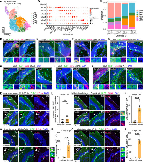 Spatially distinct tectal radial astrocyte subtypes and TBI responses of central-located qRA subtypes across stages (A) UMAP plot showing re-clustering of quiescent radial astrocytes from uninjured OT across four stages. Cells are colored by their identities. qRA, quiescent radial astrocytes. (B) Dot plot showing the expression of marker genes of each qRA subtype in (A). (C) Histograms showing the proportion of each qRA subtype at each stage. (D–J) In situ hybridization of qRA subtype-specific marker genes (zgc:153704, luzp2, ntn1a, rdh10a, tenm3) (red) combined with BLBP immunostaining (green) on the uninjured OT sections of 20-dpf (D–F) and adult (G–J) zebrafish. Left/right panels of each figure represent different regions of the OT as labeled on the images. Boxed areas are shown magnified in the bottom panels. (K, M, O, and Q) Representative images of proliferative radial astrocytes (pRA, PCNA+BLBP+) located at central OT in the uninjured (upper panel) and injured (lower panel) sides of zebrafish at the early-larval (11 dpf–3 dpi) (K), late-larval (17 dpf–3 dpi) (M), juvenile (48 dpf–3 dpi) (O), and adult (4 mpf–3 dpi) (Q) stages. Arrowheads indicate the injury sites. Boxed areas in (M), (O), and (Q) are shown magnified in the right panels; white asterisks in the zoom-in images indicate PCNA+BLBP+ pRA. (L, N, P, and R) Quantification of pRA located at central OT in the uninjured and injured sides of zebrafish at 11 dpf–3 dpi (L, n = 15 animals), 17 dpf–3 dpi (N, n = 8 animals), 48 dpf–3 dpi (P, n = 5 animals), and 4 mpf–3 dpi (R, n = 5 animals) (mean ± SEM; parametric paired t tests; ns, p > 0.05; ∗∗p < 0.01; ∗∗∗p < 0.001). In (D–J), (K), (M), (O), and (Q), dashed lines indicate OT boundaries. Scale bars, 50 μm (D1–J3, K1–K6, M1–M6, O1–O6, Q1–Q6) and 5 μm (zoom-in images). Nuclei are visualized by DAPI (blue). |