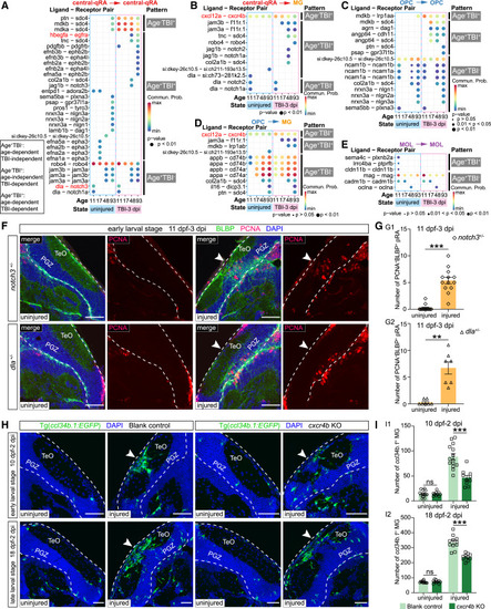 Glia interactome revealed the molecular logic underlying TBI-induced glial responses (A–E) Dot plots showing the ligand-receptor pairs with distinct patterns responsible for partial glial interactions with high communication probability (>1) among the eight conditions shown in Figure S8B. Interacting cell types are annotated above the plot. Age and states of the samples are displayed along x axis (11, 11 dpf; 17, 17 dpf; 48, 48 dpf; 93, 93 dpf), which are grouped as physiological (in blue box) and TBI (3 dpi; in pink box) conditions. y axis lists ligand-receptor pairs and distinct patterns of the interactions, with text-discussed pairs highlighted in red. Commun. Prob., communication probability. (F and G) Representative images (F) and quantification (G) of proliferative radial astrocytes (PCNA+BLBP+) located at central OT in uninjured (left two panels) and injured (right two panels) sides of 11-dpf notch3+/− (upper panel; n = 13 animals) (G1) or dla+/− (lower panel; n = 7 animals) (G2) zebrafish (mean ± SEM; parametric paired t tests; ∗∗p < 0.01, ∗∗∗p < 0.001). (H and I) Representative images (H) and quantification (I) of ccl34b.1+ microglia (green) located at central OT in uninjured and injured sides of the blank-ctrl (left two panels) or cxcr4b-KO (right two panels) Tg(ccl34b.1:EGFP) zebrafish, which were injured at the early-larval stage (upper panel, 10 dpf–2 dpi; blank-ctrl, n = 14 animals; cxcr4b-KO, n = 10 animals) (I1) or late-larval stage (lower panel, 18 dpf–2 dpi; blank-ctrl, n = 11 animals; cxcr4b-KO, n = 10 animals) (I2) (mean ± SEM; one-way ANOVA, followed by Tukey’s HSD test; ns, p > 0.05, ∗∗∗p < 0.001). In (F) and (H), dashed lines indicate OT boundaries, arrowheads indicate the injury sites. Scale bars, 50 μm. Nuclei are visualized by DAPI (blue). |