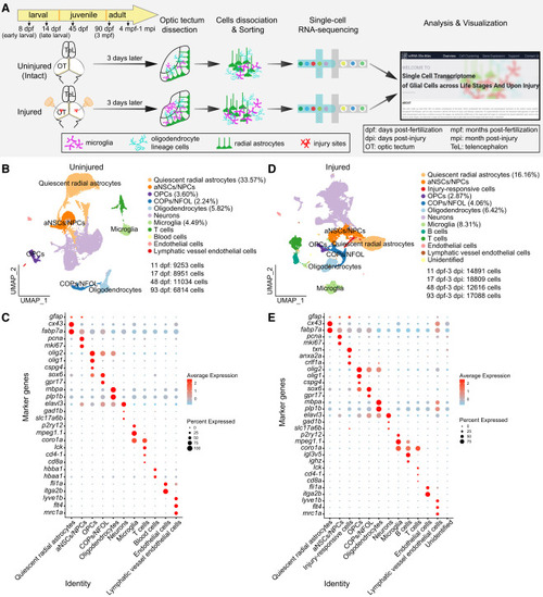 Glial heterogeneity under physiological and TBI conditions across stages (A) Schematic illustration of the experimental procedure for the glial scRNA-seq in this study. (B and D) Uniform manifold approximation and projection (UMAP) visualization of integrated scRNA-seq data of all qualified cells from uninjured (B) and injured (D) OTs across stages. Cells are colored by their identities. The proportion of each glial type is shown. (C and E) Dot plots showing the expression of canonical markers in each cell types in (B) and (D), respectively. |