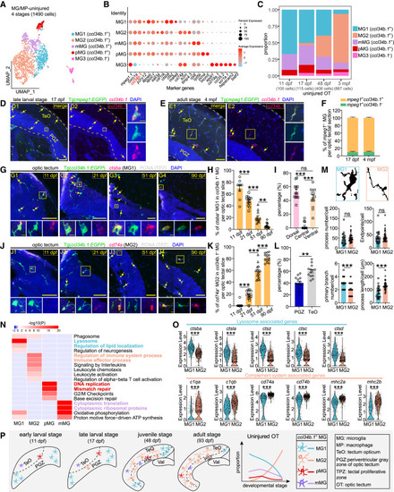 Temporal microglial heterogeneity under the physiological condition (A) UMAP plot showing re-clustering of microglia/macrophages from the uninjured OT across stages. Cells are colored by their identities. (B) Dot plot showing the expression of marker genes of each subtype in (A). (C) Histograms showing the proportion of each subtype in (A) at each stage. (D and E) ccl34b.1 in situ hybridization (red) combined with EGFP immunostaining (green) on the midbrain sections of Tg(mpeg1:EGFP) at the late-larval (17 dpf) (D) and adult (4 mpf) (E) stages. Dashed lines indicate OT boundaries, arrows indicate ccl34b.1+EGFP+ microglia. Boxed areas are shown magnified in the right panels. Scale bars, 50 μm (D1 and D2, E1 and E2) and 5 μm (zoom-in images). Nuclei are visualized by DAPI (blue). (F) Relative ratio of ccl34b.1+ and ccl34b.1− microglia in (D) and (E) (17 dpf, n = 8 sections/3 animals; 4 mpf, n = 13 sections/3 animals). (G and J) In situ hybridization of ctsba (G) and cd74a (J) combined with immunostaining of EGFP (green) and PCNA (white) on the midbrain sections of Tg(ccl34b.1:EGFP) at four stages, respectively. Signals of the probes are shown in red; arrows indicate the ctsba+EGFP+ MG1 (G) and cd74a+EGFP+ MG2 (J). Boxed areas are shown magnified in the bottom panels. Scale bars, 50 μm (G1–G4, J1–J4) and 5 μm (zoom-in images). Nuclei are visualized by DAPI (blue). (H) Percentage of ctsba+EGFP+ MG1 in ccl34b.1+ microglia per OT section at four stages in (G) (11 dpf, n = 9 sections/4 animals; 21 dpf, n = 13 sections/4 animals; 51 dpf, n = 12 sections/3 animals; 90 dpf, n = 15 sections/3 animals). (I) Relative ratio of ctsba+EGFP+ MG1 located in dorsal, central, or ventral region of OT at 21 dpf in (G2) (n = 13 sections/4 animals). (K) Percentage of cd74a+EGFP+ MG2 in ccl34b.1+ microglia per OT section at four stages in (J) (11 dpf, n = 18 sections/6 animals; 21 dpf, n = 13 sections/4 animals; 51 dpf, n = 14 sections/3 animals; 90 dpf, n = 13 sections/3 animals). (L) Relative ratio of cd74a+EGFP+ MG2 located in TeO or PGZ of OT at 90 dpf in (J4) (n = 13 sections/3 animals; mean ± SEM; parametric paired t tests; ∗∗p < 0.01). (M) Representative binary images and quantification showing differences in morphology between MG1 and MG2 (n = 23 MG1/4 animals, n = 35 MG2/3 animals; mean ± SEM; unpaired Student’s t tests; ns, p > 0.05; ∗∗∗p < 0.001). (N) GO enrichment heatmap of differentially expressed genes (DEGs) across ccl34b.1+ microglial subtypes, color coded by subtype-specific representative GO terms. (O) Violin plots showing the expression levels of lysosome-associated genes and complement system-associated genes in MG1 and MG2 (each dot represents a cell; mean ± SEM; unpaired Student’s t tests; ∗∗∗p < 0.001). (P) Schematic summary showing the temporal heterogeneity of tectal ccl34b.1+ microglial subtypes across stages. In (H), (I), and (K), data are mean ± SEM; statistical significance was determined by one-way ANOVA followed by Tukey’s HSD test (ns, p > 0.05; ∗∗p < 0.01; ∗∗∗p < 0.001). |