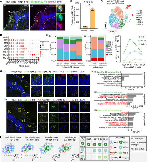TBI responses of ccl34b.1+ microglia across stages (A and B) ccl34b.1 in situ hybridization (red) combined with EGFP immunostaining (green) on the midbrain sections of injured Tg(mpeg1:EGFP) at the adult stage (A) and the quantification of ccl34b.1+ microglia at the injury sites and the contralateral uninjured sides (n = 3 animals; mean ± SEM; parametric paired t tests; ∗∗p < 0.01) (B). Dashed lines indicate OT boundaries. White arrowhead indicates the injury site. Boxed areas are shown magnified in the right panel. Scale bars, 50 μm (A1 and A2) and 5 μm (zoom-in images). Nuclei are visualized by DAPI (blue). (C) UMAP plot showing re-clustering of ccl34b.1+ microglia from injured OT at 3 dpi across four stages. Cells are colored by their identities. iMG, TBI-inducible microglia. (D) Dot plot showing the expression of marker genes of each microglial subtype shown in (C). (E) Histograms showing the proportion of each ccl34b.1+ microglial subtype at each stage in injured OT at 3 dpi (E1) and in adult OT at 1 mpi and at 3 dpi after the second injury (E2). (F) Line graph showing the change of the proportions of each TBI-inducible microglial subtype across stages. The dot, square, and triangle represent iMG-1, iMG-2, and iMG-3, respectively. (G) asmFISH of ccl34b.1 (green), f13a1b (red), ifi44d (magenta), and plaua (white) on the midbrain sections of zebrafish at the late-larval (19 dpf-3 dpi) (G1) and adult (93 dpf-3 dpi) (G2) stages, respectively. Dashed lines indicate OT boundaries. Arrowheads indicate the injury sites. Boxed areas in merged images are shown magnified in the right panels. Dashed circles indicate individual ccl34b.1+f13a1b+ iMG-1 (a), ccl34b.1+ifi44d+ iMG-2 (b), and ccl34b.1+plaua+ iMG-3 (c) in the zoom-in images. Scale bars, 50 μm (merged images) and 5 μm (zoom-in images). Nuclei are visualized by DAPI (blue). (H) Bar graphs showing the enriched GO terms of TBI-inducible microglial subtype DEGs at the adult stage. (I) Schematic illustration showing the cellular composition (left four panels) and the response matrix of ccl34b.1+ microglial subtypes in the injured OT across stages. |