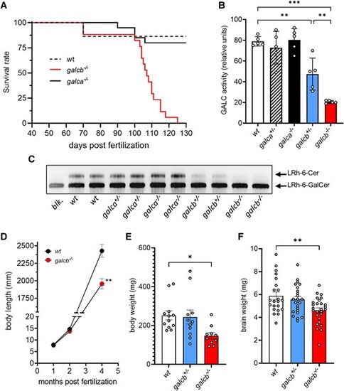 Characterization of galca and galcb knockout zebrafish. (A) Survival analysis of wild-type (WT), galca knockout (KO) and galcb KO zebrafish (n ≥ 17 animals/group). The survival of galca KO mutants and of heterozygous galca+/− and galcb+/− animals (not shown) was not significantly different for WT siblings [Log-rank (Mantel-Coz) test]. (B) GALC enzymatic activity thin-layer chromatography (TLC) assay of the brain extracts of zebrafish mutants at 4 mpf (five animals/group). (C) Representative image of a TLC assay showing the GALC activity of the brain extracts of two animals for each experimental group. (D) Body length of WT and galcb KO zebrafish measured at different times of growth. The rate of growth of galca+/−, galca−/− and galcb+/− animals was not significantly different from WT siblings (not shown). At the end stage of disease (4 months post fertilization), body weight (E) and the weight of harvested brain (F) were measured for the indicated WT, galcb+/−, and galcb−/− animals. Data are the mean ± standard error of the mean. One-way ANOVA (Tukey's multiple comparison test) in B and F; Student's t-test in D: *P < 0.05, **P < 0.01, ***P < 0.001. |