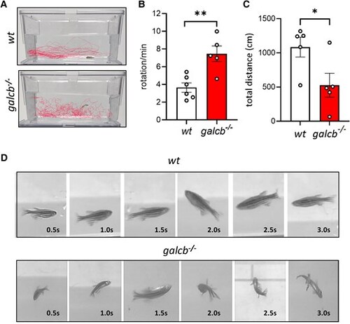 Galcb knockout zebrafish exhibits impaired locomotion behaviour. (A) Representative swim behaviour tracking for wild-type (WT) and galcb knockout (KO) zebrafish at 4 months post fertilization (mpf). Alterations of fish locomotion of galcb KO mutants versus WT siblings was recorded for 5 min from the side view of the tank and quantified by measuring the number of body rotation/min (B) and total distance moved (C) using the Ethovision software equipped with a colour camera (five animals/group). Data are the mean ± standard error of the mean. Student's t-test: *P < 0.05, **P < 0.01. (D) Time frame images from Supplementary Video 1 showing the swim behaviour of WT and galcb KO zebrafish at 4 mpf. |