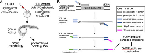 Experimental design for quantifying somatic repair events. (A) Schematic showing the steps to inject CRISPR RNPs and HDR templates at the one-cell stage, followed by scoring and isolation of genomic DNA. (B) Schematic describing the step-by-step construction of amplicon libraries for long-read sequencing. F, forward; R, reverse; UMI, unique molecular identifier.