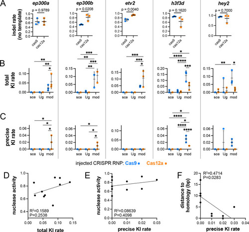 Quantification and comparison of repair events with different HDR templates and CRISPR nucleases. (A) Indel rates in embryos injected only with Cas9 or Cas12a targeting the indicated gene in the absence of HDR template. Unpaired t-test for all except hey2 for which a Mann–Whitney test was used due to the non-normal distribution of this sample; P-values indicated. (B) Total KI rate at the indicated locus, considering any integration of the epitope tag sequence. (C) Precise KI rate. (B,C) Template type indicated on x-axis. mod, linearized template amplified by PCR with 2′OMe-modified primers; sce, plasmid linearized with I-SceI; Ug, plasmid linearized with Cas9 targeting universal vector sgRNA spacers. *P<0.05, **P<0.01, ***P<0.001, ****P<0.0001 (two-way analysis of variance, Šidák's multiple comparison test). In A-C, error bars represent s.d.; n=3. (D-F) Comparison of nuclease activity (indel rate in the absence of HDR template) and total KI rate (D), nuclease activity and precise KI rate (E) and distance from the cleavage site to start of exogenous sequence and precise KI rate (F).