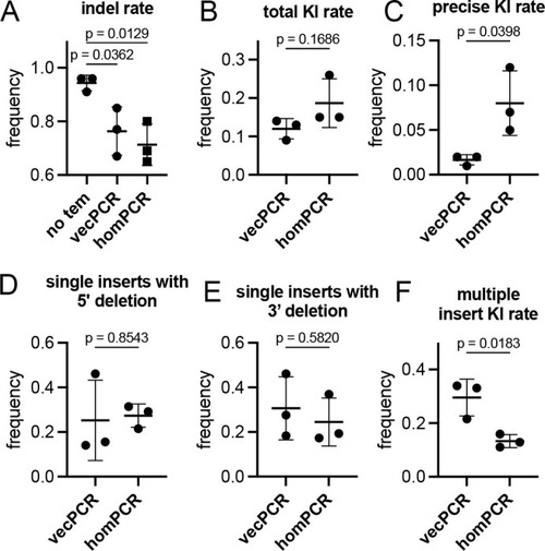 Homology-matched HDR template improves precise knock-in rates. (A) Indel rates with Cas9 RNP alone (no tem), or co-injected with HDR templates targeting the h3f3d ATG that were PCR-amplified with vector (vecPCR) or homology-matched (homPCR) primers. (B-F) Frequencies of targeted insertion of indicated repair event using vector or homology-matched template at the h3f3d locus. P-values are indicated (unpaired t-test). Error bars represent s.d.; n=3.