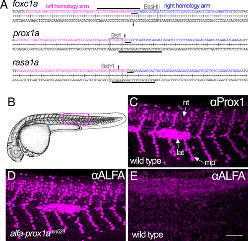 Targeted insertion of an ALFA tag using optimized knock-in parameters. (A) Sequence and flanking target insertion sites for foxc1a, prox1a and rasa1a. Left and right homology arms are indicated by magenta and blue, respectively. Black lines denote the Cas9 spacer sequence (line above or below sequence denotes positive or negative strand, respectively) and arrowheads mark the DSB sites. Start or stop codons are underlined. Restriction enzyme sites used to estimate nuclease activity are indicated by boxes and labeled. (B) Camera lucida of a zebrafish embryo at 31 hpf. Reproduced with permission from Kimmel et al. (1995). (C-E) Whole-mount immunostained embryos imaged by confocal microscopy; lateral views, anterior to the left, dorsal is up. (C) Wild-type embryos immunostained with polyclonal Prox1 antibody. Arrows denote fluorescence in neural tube (nt), lateral line primordium (lat) and muscle pioneers (mp). (D,E) Immunostaining of alfa-prox1aum529 heterozygous (D) and wild-type sibling (E) embryos with a nanobody against ALFA. Scale bar: 80 µm.