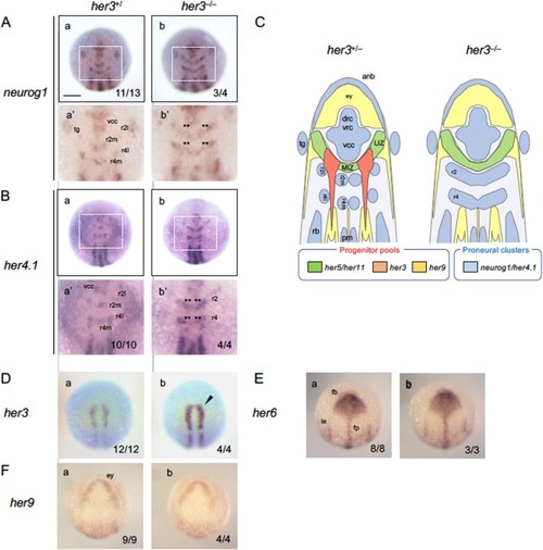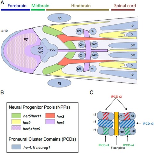 Summary of the neurogenesis pattens in the developing neural plate in zebrafish. (A) Schematic diagram of the anterior neural plate, showing distribution of proneural cluster domains (PCDs) and neural progenitor pools (NPPs) marked by various |